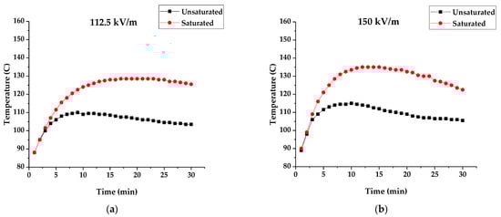 The temperature profiles with time during RF heating treatment are investigated using various electric field intensities including 112.5 kV/m, 150 kV/m, 225 kV/m, and 450 kV/m to demonstrate the difference between unsaturated contaminated soil and saturated contaminated soil. For the overall experiment, the contaminated soil sample was treated at a power of 900 W for irradiation times of up to 30 min. Here, the heating time was recorded at each min while the temperature was monitored using the infrared thermography camera (U5857A, Keysight Technologies Inc., Santa Rosa, CA, USA), and was recorded. Figure 4 shows the difference between unsaturated contaminated soil and saturated contaminated soil based on the temperature profiles with time derived from the electric field intensities of 112.5 kV/m, 150 kV/m, 225 kV/m, and 450 kV/m.