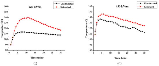 The difference between unsaturated contaminated soil and saturated contaminated soil based on the temperature profiles with time using various electric field intensities where (a) is based on RF heating treatment using 112.5 kV/m, (b) is obtained using 150 kV/m, (c) is derived from 225 kV/m, and (d) is based on RF heating treatment using 450 kV/m.