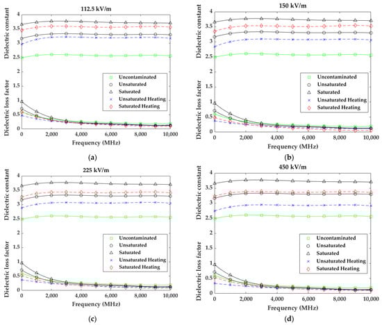 Dielectric properties of the unsaturated contaminated soil and the saturated contaminated soil samples before and after RF heating process compared with the soil without the commercial grade diesel B7 as the reference line where (a) is based on electric field of 112.5 kV/m; (b) is based on electric field of 150 kV/m; (c) is based on electric field of 225 kV/m; (d) is based on electric field of 450 kV/m.