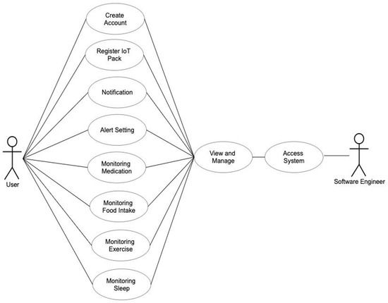 - Use case (10 use cases): Create an Account, Register to IoT Pack, Notification, Alert Setting, Monitoring Medication, Monitoring Food Intake, Monitoring Exercise, Monitoring Sleep, View and Manage, and Access System;