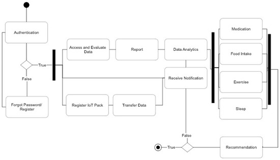 - Activity (13 activities): Authentication, Forgot Password/Register, Access and Evaluate Data, Report, Data Analytics, Register IoT Pack, Transfer Data, Receive Notification, Medication, Food Intake, Exercise, Sleep, and Recommendation;