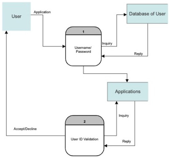 - Flow (seven Flows): Input (User) to Function (Username/Password), Function (Username/Password) to File/Database (Database of User), File/Database (Database of User) to Function (Username/Password), Function (Username/Password) to Output (Application), Output (Application) to Function (User ID Validation), Function (User ID Validation) to Output (Application), and Function (User ID Validation) to Input (User).