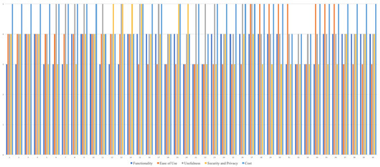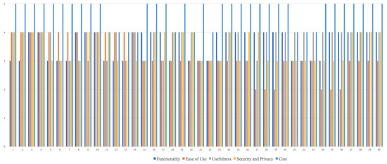 Researchers conducted an evaluation stage on the development of a diabetes mobile application for 40 participants who were users of mobile-based diabetes applications (diabetic patients). The user’s trust evaluation for mobile applications (Figure 7) adapts to five main trust factors (Table 10): functionality, ease of use, usefulness, security and privacy, and cost factors. The average value of each factor: functionality is 4.57; ease of use is 4.67; usefulness is 4.75; security and privacy are 5.0; cost is 4.70. The values as based on the results of the evaluation using a Likert scale of strongly agree, agree, neutral, disagree, and strongly disagree with an assessment weight of 5, 4, 3, 2, and 1, respectively. Based on the results of this evaluation, two indicators, namely the functionality and ease of use factors, have an evaluation with an input value of 3 (neutral). Table 13 describes the representations of the comparison between versions 1 and 2.