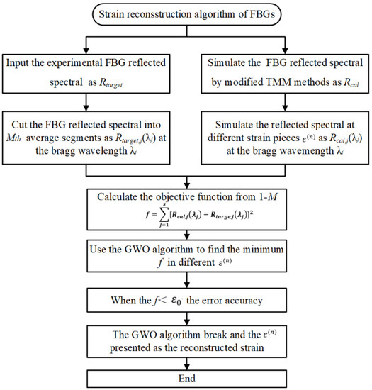 The authors of [14] found that a simulated spectrum based on an improved transfer-matrix algorithm exhibited a high degree of matching with a real-world experimental spectrum. A simulated spectrum obtained by such means can, therefore, be used for the strain reconstruction of an FBG sensor. This can be achieved by iterating the error between the simulated spectrum and the target experimental spectrum under unknown strain distribution until the error requirements are matched. A GWO algorithm can then be used for parameters of global optimization of error between the experimental and simulated spectra. An arithmetic flow chart of the strain reconstruction algorithm of FBGs can be presented in Figure 2 as follows: