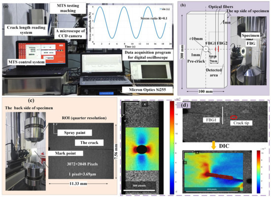 The FBG fatigue crack damage-monitoring test platform and the DIC processing method. (a) an experimental platform for fatigue detection of hole-edge crack damage; (b) the FBG sensor placement on the specimens; (c) an experimental platform for DIC measurement system; (d) the image processing techniques by the DIC method.