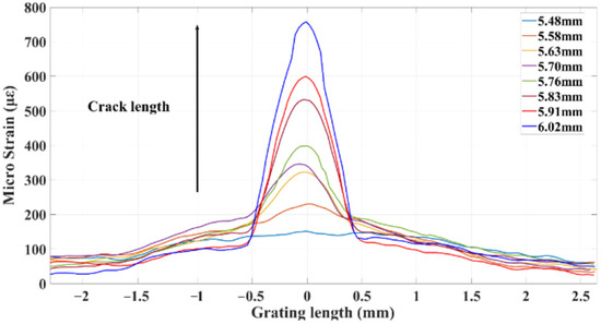 In order to avoid abnormal experimental phenomena caused by operational errors, two parallel experimental procedures were used in this study. In the upper part of the test piece, two FBG sensors (FBG1 and FBG2) were bonded perpendicular to the crack propagation direction with epoxy resin glue of 1 mm thickness, with a fixed gluing length more than twice the length of the grating area, so that the best strain transfer efficiency could be obtained. FBG1 and FBG2 were also used as local sensors to detect the axial strain distribution of the patched area during crack growth, as shown in Figure 3b, and they were also used comparatively to determine the grating length’s influence on the monitoring level. In order to eliminate the temperature influence on the wavelength shift of the FBG reflection spectrum, the FBG3 was bonded in a free-strain condition onto the back of the specimen that served as the control experiment with the FBG1. The central air conditioner of the experimental system was adjusted, and the temperature was set to 18.5 °C. The parameters of the FBG sensors are shown in Table 1.