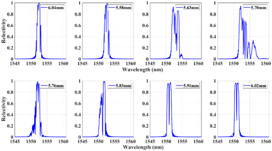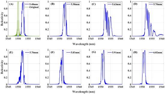 Experimental reflection spectra of FBG1 sensor for different crack lengths. (A) 5.48 mm; (B) 5.58 mm; (C) 5.63 mm; (D) 5.70 mm; (E) 5.76 mm; (F) 5.83 mm; (G) 5.91 mm; (H) 6.02 mm.