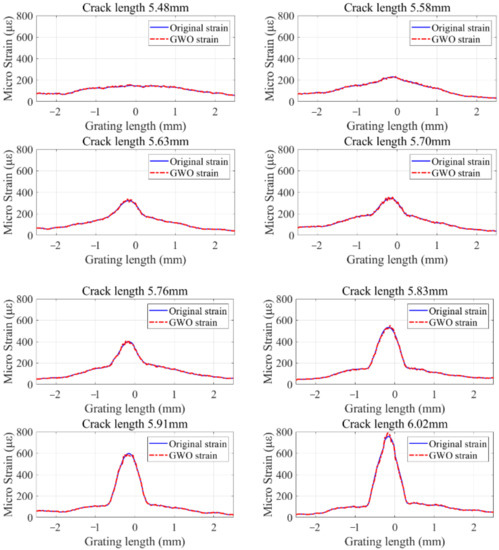 Finally, the precision of strain distribution reconstructions using the GWO algorithm under different crack lengths, in terms of RMSEs between the experimental and reconstruction strain values, can also be demonstrated, as shown in Table 2.