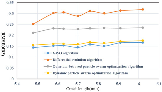 To compare the algorithm proposed here with other, more traditional algorithms used in previous studies, we also used RMSE as a quantitative evaluation index [6,19]. The RMSE results for experimental and reconstruction strains produced by different swarm intelligence techniques, i.e., the differential evolution algorithm, the quantum-behaved Particle Swarm Optimization algorithm, and the dynamic Particle Swarm Optimization algorithm, can be seen in Figure 8. These RMSE results are also related to different crack lengths during the damage monitoring experience, to further test the stability and accuracy of the reconstruction algorithm. Upon comparison with the traditional algorithms previously mentioned, the proposed GWO method presented the best strain reconstruction performance with the lowest RMSE. In short, the inverse problem in a real fatigue loading test can be effectively solved by use of the GWO method in a strain reconstruction algorithm.