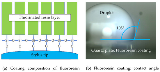 When moisture is present on the stylus tip or the measured surface, liquid bridges are formed between the contacting surfaces at the moment of contact. This liquid bridge generates a liquid bridge force when the stylus tip is pulled away from the measured surface. One possible method to reduce the liquid bridge force is to create a vacuum or low humidity in the measurement environment to prevent water from adhering to the stylus tip [21]; however, it is difficult to create such an environment at the actual measurement site. Therefore, a water-repellent coating was investigated to change the contact angle with the liquid as a method to reduce the influence of liquid bridge force.