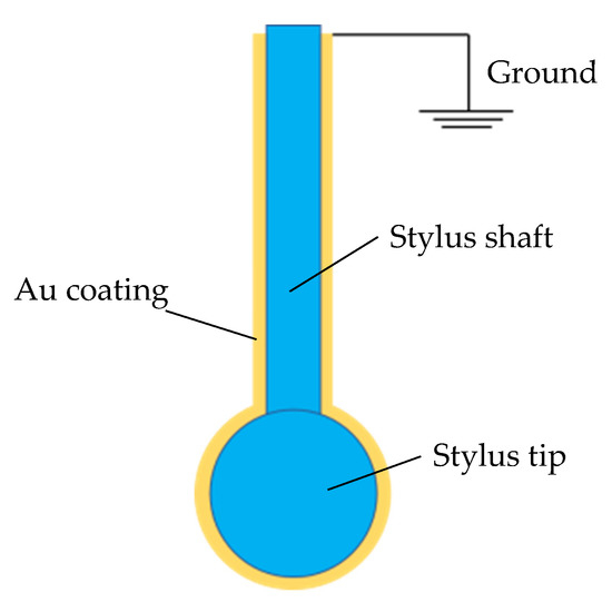 Surface forces mainly consist of van der Waals force, electrostatic force, and liquid bridge force. Van der Waals forces are interactions between molecules (or atoms) and are universal, always acting between objects. Liquid bridge force is an adhesion force caused by liquid bridging formed at a contact area. Force between the charged stylus tip and the measured surface is called electrostatic force [22]. When the charged stylus is brought close to the charged surface to be measured and the distance between the stylus tip and the measured surface becomes 10 µm or below while using the stylus shaft and tips with diameters of 20 and 35 µm, the stylus tip is attracted to the measured surface by the electrostatic force and may stick to it [21]. The adsorption distance decreases as the diameter of the stylus shaft increases. It is necessary to move the stylus approximately 60 µm to pull it away from the measured surface due to liquid bridge force and electrostatic force once it is attached to the measured surface. In humid environments, once the stylus tip makes contact with the measured surface, large liquid bridge force acts between the stylus tip and the measured surface. A stylus shaft with a diameter of several tens of micrometers or more can easily pull the stylus tip away from the measured surface due to its high rigidity. However, when the diameter of stylus shaft is less than several tens of micrometers, the deflection of the stylus shaft is larger, and the stylus movement required to pull it away from the measured surface is larger. Surface forces acting on the stylus tip also decrease as the diameter of the stylus decreases. However, the decrease in stylus stiffness with decreasing diameter is greater than the decrease in surface forces; therefore, the stylus deflection (the distance in Figure 1) increases with the decreasing stylus diameter, leading to increased measurement time and reduced measurement accuracy.