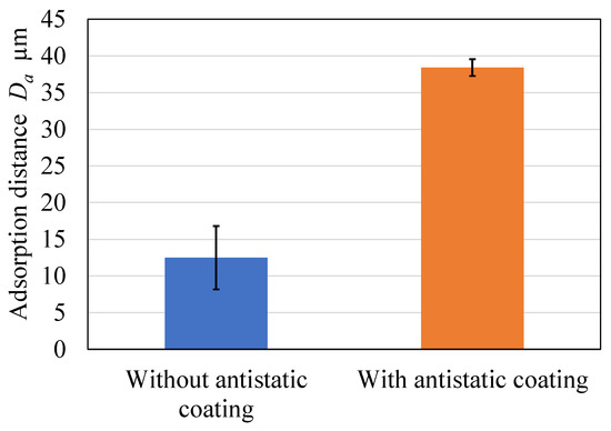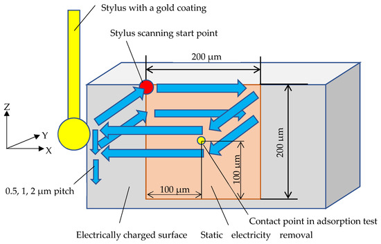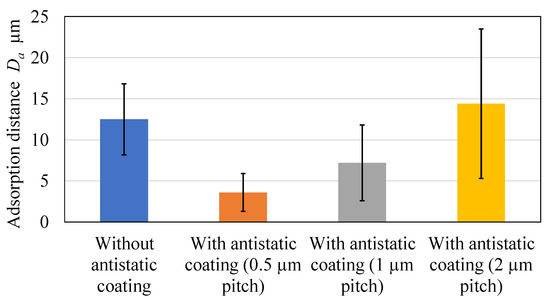 Figure 7 shows an adsorption test conducted between the charged surface and the stylus tip. When the stylus was brought close to the charged surface (Figure 7a) and the distance between the stylus and the measured surface fell below Da (Figure 7b), the stylus adhered to the measured surface due to electrostatic forces. The adsorption distance, Da, was then measured. The material of the measured surface was fluoroplastic, and the surface was charged to −100 V using a charging gun. The adsorption distances for styluses with and without antistatic coating are shown in Figure 8. The adsorption distance of the stylus with an antistatic coating is greater than that of the stylus without an antistatic coating. This is thought to be because when the gold-coated stylus approaches the charged surface, the coated surface of stylus tip is inductively charged with the opposite polarity of the charged surface, increasing the attraction between the charged surface and the stylus tip. To reduce the effect of induced charging, the stylus with an antistatic coating was used to scan the area near the contact point to eliminate static electricity; then, the adsorption test was performed again. As shown in Figure 9, a 200 µm square around the contact point in adsorption test was scanned with the stylus tip in contact at 0.5, 1, and 2 µm pitch in the Z-axis direction to eliminate static electricity. The times required to scan a 200 µm square region are 463, 916, and 1833 s for 2, 1, and 0.5 µm pitch, respectively. The adsorption test was then conducted again. Figure 10 shows the average adsorption distance after scanning. When the scanning pitch in the Z direction was 2µm, there was almost no change in the adsorption distance, but rather, an increase. With a scanning pitch of 1 µm, the adsorption distance was 7.2 µm on average, with a 42% reduction in adsorption distance compared with the uncoated stylus. When the scanning pitch was 0.5 µm, the adsorption distance was 3.6 µm on average, a reduction of 71% in adsorption distance compared with the uncoated stylus.