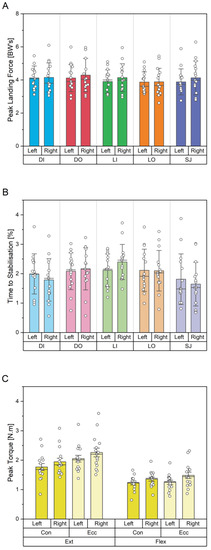 A total of 15 participants were included in the final analysis (age: 20.80 ± 1.42 years; height: 1.75 ± 0.06 m; body mass: 71.69 ± 13.58 kg). The summary data and individual data points for peak landing forces, TTS, and isokinetic peak torques are highlighted in Figure 2.