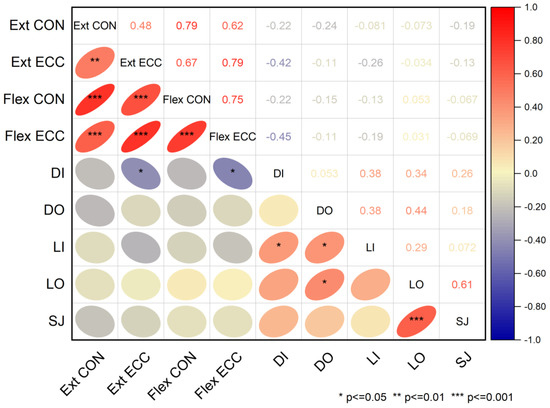 Spearman rank correlation for multidirectional TTS and normalised isokinetic peak torque values. Correlation coefficients are shown in the top-right corner; correlation ellipses and significance are shown in the bottom-left corner. Positive correlations are red-shifted, and negative correlations are blue-shifted on the colour spectrum. Ext = extensor; flex = flexor; CON = concentric; ECC = eccentric; DI = diagonal inside; DO = diagonal outside; LI = lateral inside; LO = lateral outside; SJ = straight jump.