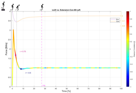 Representative landing force–time trace with SPM regression result for the relationship between landing force (bottom coloured line) and concentric extensor strength. Note: The force–time trace is linked to the primary y-axis, whereas each time node (x-axis) for the force trace exhibits a Pearson correlation coefficient that is colour-coded based on magnitude and direction (see colour bar). The largest positive (red) and negative (blue) coefficients are highlighted for reference. The displacement of the CoM (top line) is linked to the secondary y-axis and is colour-coded based on the eccentric (purple) and concentric (light orange) phases of landing. The vertical black dotted line represents the transition phase from eccentric to concentric landing. The vertical pink dotted line represents the time point at which stability was reached.