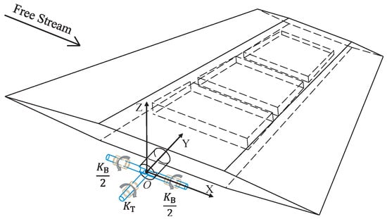 Generally, for a small aspect ratio supersonic fin, the structure of the fin is more rigid than the attachment part [35], which means the modal frequency of branch 2 is much higher than that of branch 1. So the consideration of branch 2 has little influence on the aeroelastic characteristics of the fin [36], and it can be approximated as a rigid body. Equation (2) can be reduced to the following form: