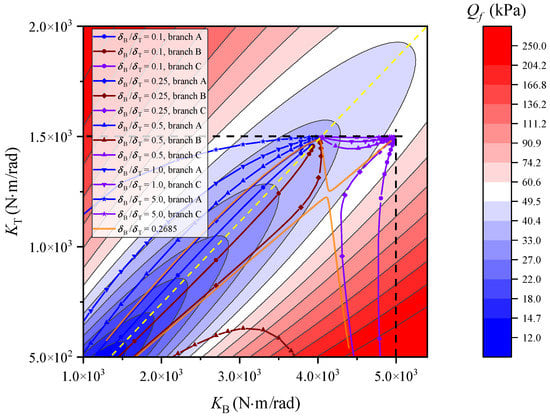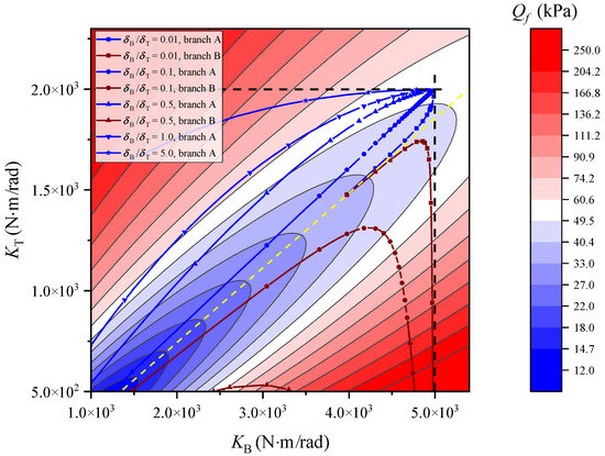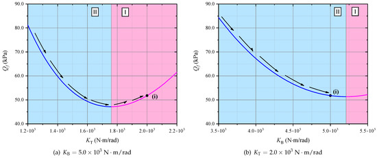 According to the DF method, different LCO amplitudes correspond to different spring stiffnesses. Therefore, the effect of different torsional or bending stiffness on the linear flutter dynamic pressure was investigated first, as shown in Figure 4a and Figure 4b, respectively.