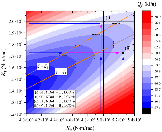 In addition, we can calculate the variation of the linear flutter dynamic pressure with different bending and torsional stiffnesses, as shown in Figure 6. In Figure 6, along the horizontal direction, the bending stiffness of the fin changes, while along the vertical direction, the torsional stiffness changes. The blue arrow indicates that the linear flutter dynamic pressure decreases with increasing stiffness, while the magenta arrow indicates that it increases. The results shown in Figure 4a,b finally map to the vertical and horizontal lines through point (i) in Figure 6, respectively. For example, the vertical line through point (i) (marked as (i)-V) reflects that the fin with single torsion freeplay nonlinearity (marked as Ndof = T) exhibits LCO-i characteristics, corresponding to the results of Figure 4a and Figure 5a. Moreover, the horizontal line through the point (i) (marked as (i)-H) reflects that the fin with single bending freeplay nonlinearity (marked as Ndof = B) exhibits LCO-ii characteristics, corresponding to the results of Figure 4b and Figure 5b. Similarly, it can be found that the LCO characteristics of the fin in state (ii) are completely opposite to those of state (i).