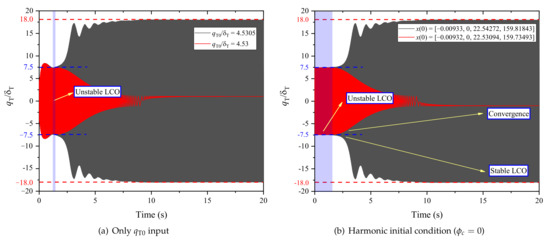 Figure 5 also shows the results of stable and unstable LCOs obtained from time-domain simulations. The verification and calculation of unstable LCO in the time domain mainly use harmonic initial conditions to find the process of an approximately constant-amplitude vibration response. Figure 7a shows the time-domain response of the nondimensional LCO amplitude with only input. The results show that when changes from to , the system response changes from convergence to LCO. This transition occurs around , which is exactly the same as the nondimensional amplitude of the unstable LCO calculated by the DF method (Figure 5a, ). When only the input is non-zero, the system response first transitions to an intermediate state. If the amplitude of this intermediate state is greater than the amplitude of the unstable LCO, the system response decays, otherwise, it increases to the stable LCO. Figure 7b shows the time-domain response with a harmonic initial condition corresponding to the unstable LCO at 48 kPa. The phase parameter of the harmonic initial condition is set to 0. Since the harmonic initial condition causes the system state to fall within a small neighborhood near the theoretical LCO trajectory, it is necessary to slightly adjust the harmonic initial condition (the whole is multiplied by a number around 1.0) to observe the unstable LCO for a long enough time. Unlike Figure 7a, the system response initially enters an approximately constant-amplitude vibration process, which corresponds to the unstable LCO. Then as time goes on, the system response will decay or enter the stable LCO. The LCO amplitude is consistent with the result in Figure 5a.
