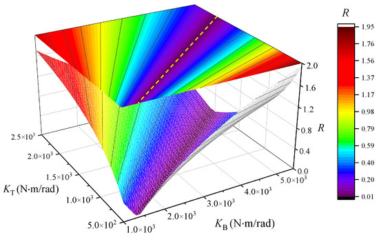Furthermore, the tangent points of the pressure contour lines and the vertical or horizontal lines can be connected into two orange straight lines; the slopes of these lines are recorded here as and , where represents the ratio of torsional and bending stiffness. Another understanding of and is that if the bending stiffness is constant, when satisfies , the flutter dynamic pressure will achieve its minimum value; similarly, if the torsional stiffness is constant, achieves the minimum value when satisfies . When there is a torsion freeplay nonlinearity, divides the entire computational domain into two parts, where corresponds to LCO-ii, and corresponds to LCO-i. When there is a bending freeplay nonlinearity, divides the entire computational domain into two parts, where corresponds to LCO-i, and corresponds to LCO-ii. Therefore, if the bending and torsional stiffnesses of the system are located between the lines and , that is, , the system exhibits LCO-i characteristics no matter whether there is a bending or torsion freeplay nonlinearity. Furthermore, from the results of the calculation, it can be seen that changing the bending and torsional stiffness does not change the values of and ; therefore, the LCO characteristics of the system can be changed by changing the ratio of bending and torsional stiffnesses.