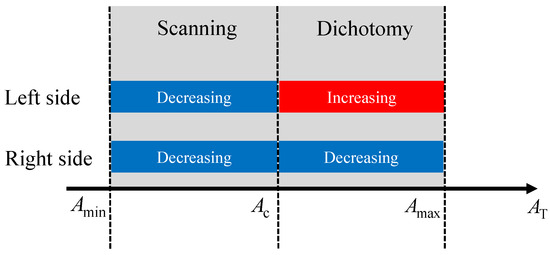 In this study, the Hénon–RK45 method [13,14] is used to integrate Equation (14). For simplicity, Equations (14) can be expressed as . The fourth–fifth-order Runge–Kutta scheme (RK45) is used for numerical integration until the monitored variable passes through the upper or lower boundary of freeplay. Assume that the value of the monitored variable is at the crossing point ( is or ), the last time instance before crossing is , and the corresponding states are . Then, the Hénon method is used to make the monitored variable reach the discontinuity point precisely via the following steps: