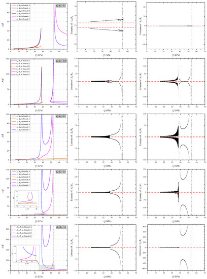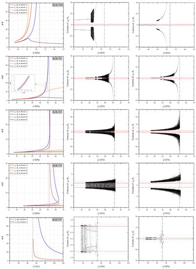 According to the solving interval and the continuity of the LCO solutions with the parameters, three LCO branches are defined here. In Figure 20, when , LCO branches A and B are located on either side of the yellow dotted line (two solution intervals) and converge at the top right. In contrast, branch C is relatively independent. With the decrease of , Branch C moves toward the right dotted line, and branches A and B move toward the yellow dotted line. The intersection point of branches A and B moves down and left, which means the right boundary of the dynamic pressure region of LCO branches A and B in Figure 19 is shifted to the left. If decreases to 0, LCO branches A and B would disappear and the system would exhibit LCO-ii characteristics similar to Figure 5b, as determined by the torsion freeplay. From the frequency-domain LCO solutions in Figure 19, there is no matching LCO solution in a certain dynamic pressure region when . The corresponding time-marching results show that the system response decays in this dynamic pressure region. Branch C is in the right of the region. This dynamic pressure region keeps shrinking with increasing , and it disappears completely at . Through further computational analysis, it was found that branches B and C meet and undergo recombination when is approximately . The relevant results are presented in Figure 20.