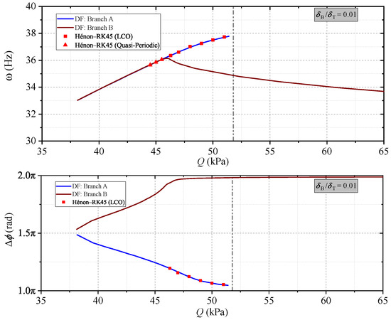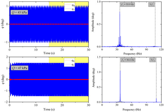 Figure 14 shows plots of the variations of the LCO frequency and the phase difference with dynamic pressure. The frequency of the quasi-periodic motion refers to the frequency of the component with the highest proportion. The frequency-domain calculation results show that the frequencies of the two LCO branches are relatively close until the turning point of the torsional LCO frequency at about kPa; however, the phase differences between the responses in the bending and torsional DOFs of the two branches have completely opposing trends. After the system enters the LCO at kPa, the frequency and phase of the time-domain LCO response are consistent with the LCO solutions of branch A. Figure 15 shows the spectral-analysis results of the time-domain response in the yellow area. Not surprisingly, we find that the LCO response at 47 kPa mainly contains the components of one frequency and its multiples, while the quasi-periodic motion at 45 kPa contains some irreducible frequencies. The frequency of the component with the highest proportion is consistent with the frequencies of the two LCO branches (Figure 14). However, some other frequency components cannot be obtained by the method in this paper; these may be generated by the coupling effects of LCO branches with similar amplitudes and frequencies but different phase differences. Another interesting phenomenon is that when the two LCO branches are very close, this quasi-periodic motion disappears, such as when the dynamic pressure is less than 44 kPa at or less than 28 kPa at .
