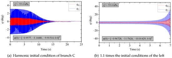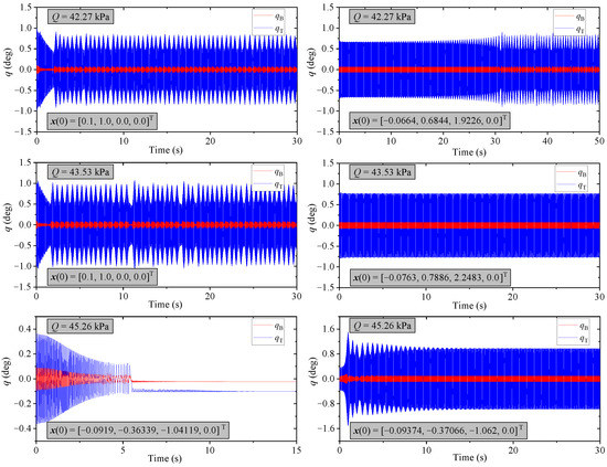Time responses of systems at different dynamic pressures and initial conditions. ( kPa: harmonic initial conditions of branch A (right); kPa: harmonic initial conditions of branch A (right); kPa: harmonic initial conditions of branch B (left), times the left initial conditions (right). . The phase parameter of the harmonic initial condition is set to .)