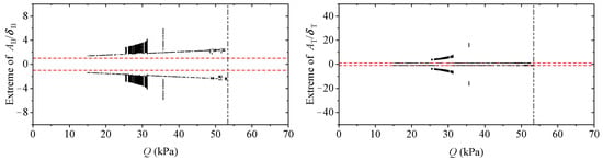 Considering that the current initial conditions might not excite the system to enter the LCO, we increased the amplitude of the initial conditions. The corresponding time-domain bifurcation diagrams are shown in Figure 22. When the initial conditions increase from 10 times the freeplay size to 100 times, quasi-periodic or chaotic motions appear between dynamic pressures of and kPa. However, the existence of such vibrations with a non-zero amplitude is uncertain because the system enters a decaying motion under some dynamic pressures between and kPa. In addition, a quasi-periodic motion occurs alone at kPa. In general, the existence of LCO branches A and B theoretically causes the system to exhibit more quasi-periodic or chaotic motions, but such vibrations are uncertain and have great dependencies on the initial conditions.