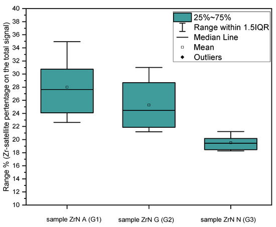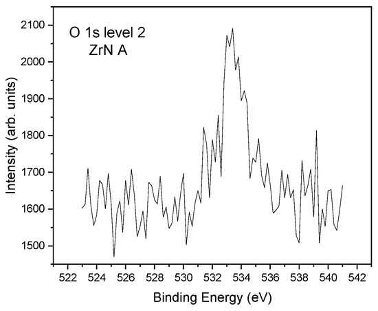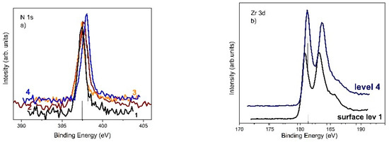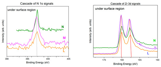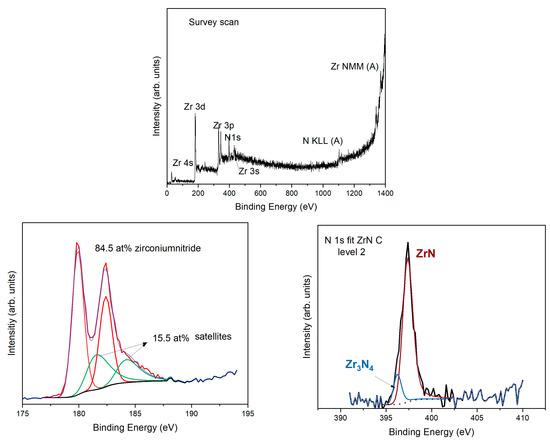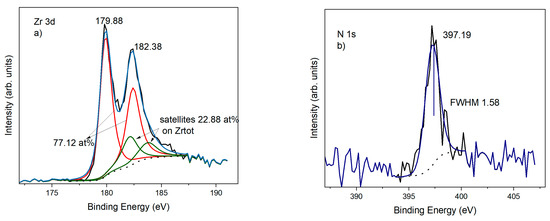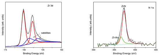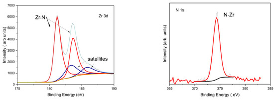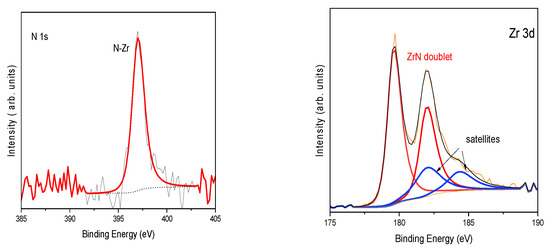 - the separation of shake-up satellites from the line-Zr 3d-doublet associated with zirconium nitride was fixed at + 2.5 eV [16], where the sign indicates the shift at higher binding energies with respect to the main peak (j = 5/2 as well as j = 3/2). The reference value was also supported via an internal laboratory database, the TiN system, about which the authors know well, and presents affinities with the ZrN system [21];