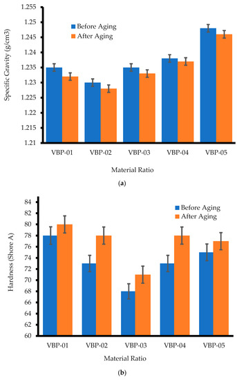 The specific gravity of vulcanized rubber describes the density of space per cubic centimeter that is occupied by additives and fillers. Results from the VBP-01 specific gravity test were 1.234 g/cm3 before aging and 1.232 g/cm3 after aging. The specific gravity value of VBP-01 was higher than the specific gravity of VBP-02, but it was lower from VBP-03 to VBP-05. The specific gravity values of VBP-03 to VBP-05 before and after aging increased (Figure 1a) in direct proportion to the increase in the ZS ratio (Table 1). The increase in specific gravity was affected by an increase in the ZS ratio added to the rubber compound during compounding. ZS and DOP in the compounding process accelerated the stretching of the molecular structure of the NR mixture with synthetic rubber. The addition of plasticizers into the rubber matrix can increase the strain and mobility of polymer chains [30]. Stretching the molecular structure of the rubber mixture using DOP accelerated the distribution of additives and fillers into the rubber mixture matrix.
