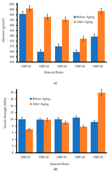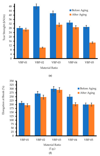 Tensile strength is the force required to pull a material to break [38,39,40,41,42]. The result of tensile strength before an aging test for formula VBP-01 was the same as VBP-03 (10 MPa) but slightly lower than formula VBP-04 (10.5 MPa). The tensile strength test results of VBP-01 after aging were lower than those of VBP-02 to VBP-05 (Figure 1d). The tensile strength results after the aging test experienced a significant increase. The increase in tensile strength after aging was probably caused by the cross-linking reaction that continued during aging, which was carried out at 70 °C for 72 h.