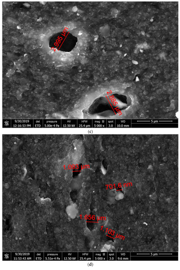 Polysulfide cross-links and sulfur bridges can affect the homogeneity of the material and the pore diameter. This event occurs due to the formation of heat by sulfur by forming mono-, bi-, and poly-sulfide bridges between polymer chains [4]. Scan results with SEM for the VBP-01 sample are shown in Figure 2a. There were pores between the rubber vulcanizate molecules. The existing pores formed by the gas during vulcanization were then trapped in the vulcanized rubber. The pore diameters that were formed were not uniform as each measured 345.50 μm, 1.092 μm, 1.594 μm, and 2.121 μm. According to Kim et al. [59], the formed pores are caused by heat propagation on the rubber vulcanization matrix, which forms gas bubbles. Heat propagation in vulcanized rubber contained elements C and O, which decomposed into CO2, and was then trapped between the rubber molecules.
