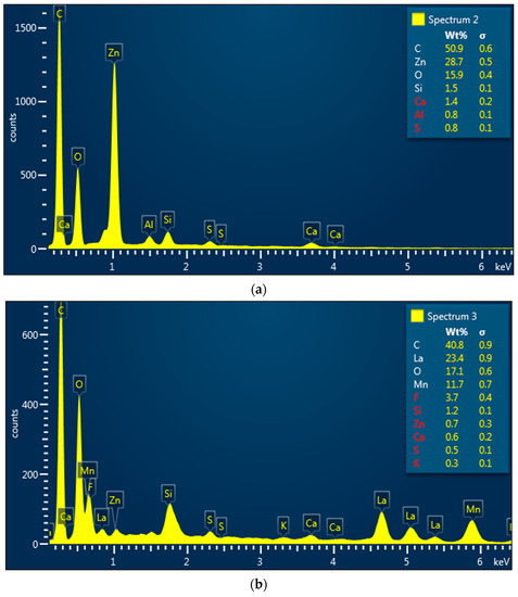 The results of the SEM-EDS reading of sample VBP-02 (Figure 3b) contained elements C 40.8% Wt, La 23.4% Wt, O 17.1% Wt, Mn 11.7% Wt, F 3.7% Wt, Si 0.7% Wt, Ca 0.6% Wt, S 0.5% Wt, and K 0.3% Wt. The VBP-02 sample was dominated by C, La, and Mn elements. The peak height and area of each EDS reading were affected by the vulcanization rate, cross-linking reactions, and intermolecular interactions of the materials used.