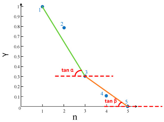 The decision values are normalized and processed in descending order. Figure 3 is a schematic diagram of the decision diagram, represents the total number of sample points, and represents the decision value of the sample point, in which there are sample points; the decision value of sample point is , and the decision value of sample point is . The number of clustering centers is usually greater than one but less than the total number of sample points. We take these two points as fixed points and connect the intermediate sample points to obtain two straight lines. Then, we calculate the tangent value.