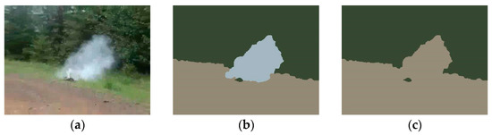 Usually, TSDPC divides the smoke image into two categories: foreground and background, but there are also cases where TSDPC divides the smoke image into three categories. As shown in Figure 8, the selection of the number of clustering centers affects the segmentation results. Figure 8b is the clustering result of TSDPC, which divides the smoke image into three categories. Figure 8c is the manual selection of two clustering centers, and the result does not separate the smoke area.