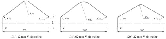 V-structure specimens were scaled down from a representative MRAP to 1:8.3 scale []. Geometrically similar scaling of a TM-57 anti-vehicle landmine (with an effective explosive diameter of 316 mm) and a popular armoured personnel carrier (approximate width of 2.5 m, ground clearance of 0.41 m) fixed the specimen width at 300 mm. The V-structures were manufactured by folding nominally 2 mm thick Domex 700 MC steel into the required geometry using a CNC plate bender. Three variants were produced: (i) a 105° internal angle with an external tip radius of 32 mm, (ii) a 105° internal angle with an external tip radius of 62 mm, and (iii) a 120° internal angle with an external tip radius of 32 mm. An example of the folded profile of a typical blast test specimen is shown in Figure 1.