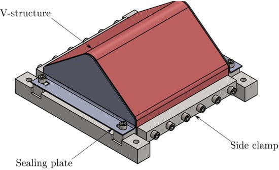 Schematic showing the clamping system and sealing plates along the edges of the V-structure.