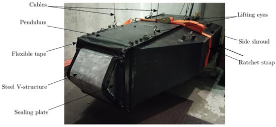 The clamp design minimized unrealistic recirculation of the pressure at the clamped interfaces, allowing the blast pressure to deflect laterally and flow away without artificially increasing the global impulse transfer. To prevent leakage of the explosion’s gas products and dust ingress through the free sides, sealing plates were attached to the mounting frame. The small gaps between the sealing plates and the V-structure were covered using flexible adhesive tape; this prevented ingress but allowed the sides of the specimen to move without significant constraint. A photograph of the experimental arrangement prior to blast testing is shown in Figure 3.