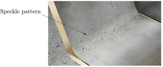 Only the middle part of the V-structure could be filmed due to depth-of-field limitation, in 1024 by 760 pixels. The rear surface of central V-ridge was sand-blasted and treated with acetone wipe before being painted with a black and white random speckle pattern (with an average speckle size of approximately 0.8 mm), as shown in Figure 4. Two high-speed monochrome IDT NRS4 cameras (filming at 33 kfps with an exposure time of 31 µs) and LED lighting were positioned to provide a clear field of view of the central strip, following Curry and Langdon []. The stereo-imaging system was calibrated to find the system projection and distortion parameters. A 19 × 19 pixels subset size and a grid spacing of 4 pixels were maintained for all tests. Digital image correlation was employed to analyse the captured images and obtain the out of plane transient displacement along the V-ridge.