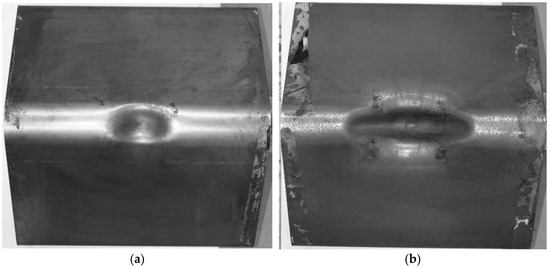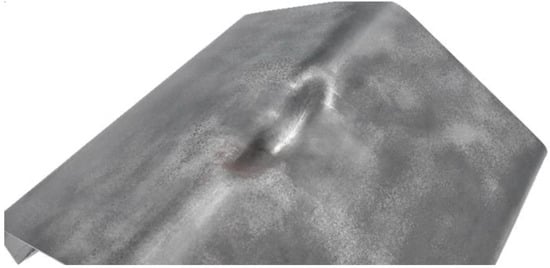 All the blast-tested V-structures exhibited damage in the form of extensive plastic deformation in the region in close proximity to the detonation (the central part of the structure). Photographs of typical damage are shown in Figure 5 and Figure 6. The central ridge plastically deformed inwards, as shown in the photographs in Figure 5 and Figure 6. As charge mass was increased, the deformation increased in magnitude and a larger proportion of the ridge was affected, as shown by comparing the damaged regions in Figure 6a (10 g) and Figure 7b (40 g). This is in contrast with the deformation mode observed in similarly loaded V-structures with a much tighter 4 mm tip radius in [], where the ridge barely deformed and the inclined sheeting plastically deformed inwards and pinched behind the ridge.