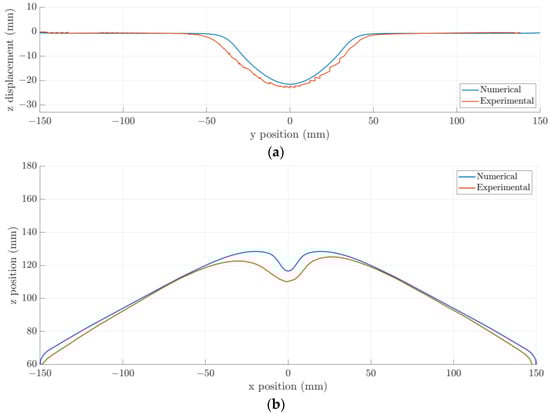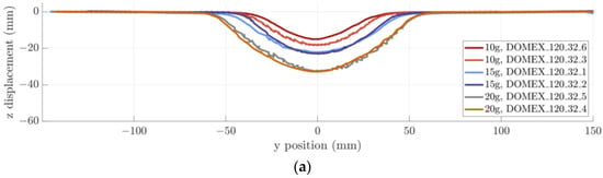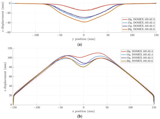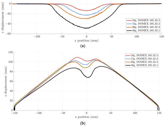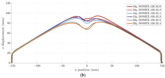The permanently deformed profiles of the 120° V-structures with a tip radius of 32 mm were similar to the 105° panels of the same bend radius in the ridge direction, as shown in Figure 10a. However, the deformation in the cross-cut plane (in Figure 10b) was less localized than exhibited by 105° V-structures, probably due to the decrease in overall structural rigidity. Good repeatability of the deformed profiles, in both directions, in the repeated 10–20 g detonations, was observed.