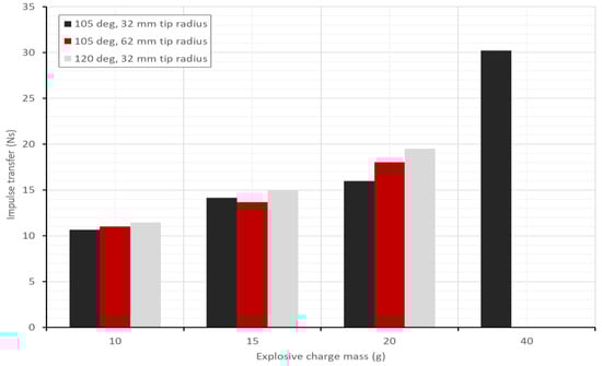 A graph of impulse transfer versus charge mass is shown in Figure 11. Similar impulses were transferred by the three types of V-structure during the 10–15 g charge mass detonations. At 20 g, the 105° V-structures outperformed the 120° specimens, through lower impulse transfer. It also appears that the 32 mm tip radius is more effective at reducing impulse transfer than the 62 mm radius at 20 g. These were both expected results. The lower internal angle is known to be better at laterally deflecting the blast pressure [,,,,,,], and previous modelling predicted that larger bend radii would be detrimental []. Unfortunately, the complexity and cost of the experiments limited the number of tests that could be performed; however, the consistent trends observed gave confidence in the test’s execution and provided useful information for validation of the simulations.