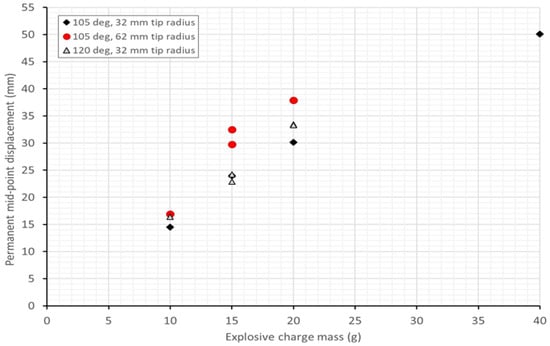 The influence of structural geometry on the permanent displacement is more clearly visible in the blast data. Figure 12 shows a graph of permanent mid-point versus charge mass. The 62 mm tip radius exhibited the largest displacement, despite the smaller internal angle, even when the overall impulse transfer was lower. The larger bend radius seems to produce a more flexible central region in the V-structure, whereas the tighter bend radius may be more work-hardened due to the cold bending process and may result in a more structurally rigid shape. Interestingly, the permanent displacement of the V-structure seemed more strongly influenced by the bend radius than the internal angle, and the impulse transfer seemed more affected by the internal angle.