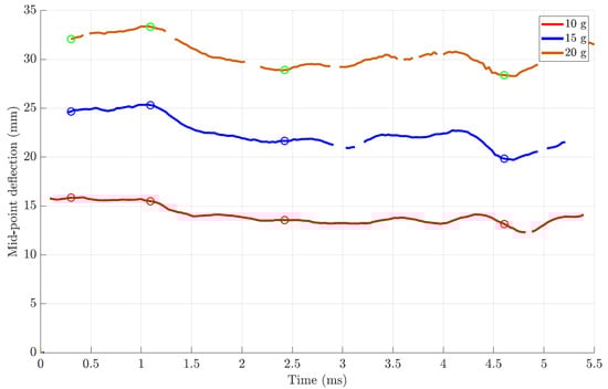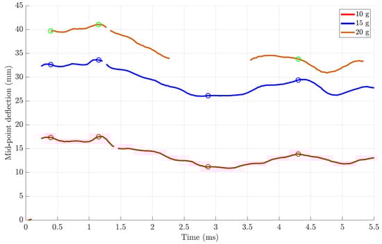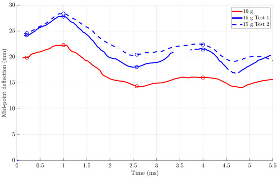 Graph of transient midpoint displacement versus time obtained from the blast tests on 105° V-structures with 62 mm tip radii (circles indicate the discrete times for the selected deformation profiles).