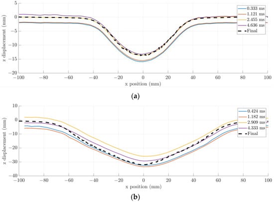 Transient deformation profiles at discrete times, along with a ridge, in 105° V-structures with (a) 10 g PE4, 32 mm tip radius, (b) 15 g PE4, 62 mm tip radius.