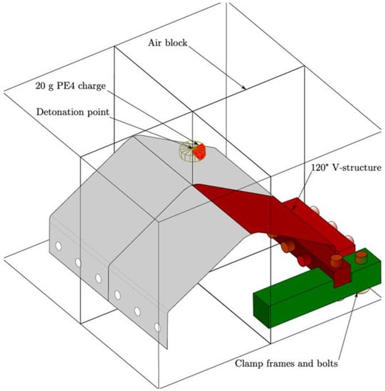 The V-structures used in MRAP vehicles mitigate the blast by laterally deflecting the explosive shock waves away from the passenger compartment, reducing the loading transmitted through the compartment floor and lowering the vertical global impulse transfer to the vehicle [,,,]. Over the last 50 years, the use of V-structures has reduced injury rates from explosive charges detonated under the centre of vehicles’ undersides [].