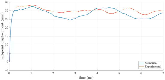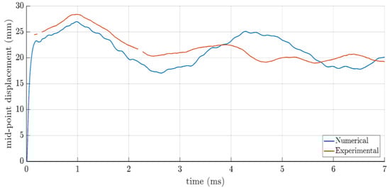 Some typical displacement-time histories from simulations are compared to their experimental equivalents in Figure 18 and Figure 19. The transient mid-point displacement evolution was similar, showing good agreement between the experimental and simulated peak mid-point displacements and permanently deformed profiles.