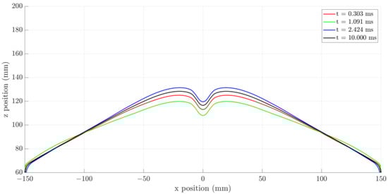 A recent numerical study examined the influence of the bend radius (of the “V-tip” at the apex of the V-structure) and internal angle on the impulse transfer from explosions at different stand-off distances []. The model was validated using experimental results on rigid V-structures with sharp tips (effectively a bend radius of zero). The results indicated that impulse transfer was sensitive to the bend radius when the stand-off distance was kept constant, such that more impulse was transferred when the bend radius was increased (but since the ground clearance was reduced, this is viewed as a potential benefit). When the ground clearance was kept constant, the stand-off distance increased with increasing bend radius, and no measurable difference in global impulse transfer could be distinguished.