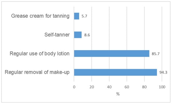 Figure 2 shows aspects of the skin care behaviour of the dancers examined. While not for all dancers, regular make-up removal was part of the routine, and despite the preference for very warm or hot water temperatures when showering, only 86% stated that they regularly use a nourishing body lotion.